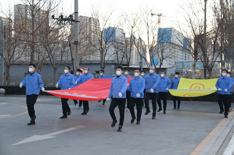 隨著《義勇軍進行曲》的響起,三面旗幟伴著太陽一同升起,全體員工懷著激動的心情向國旗行注目禮。