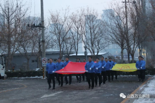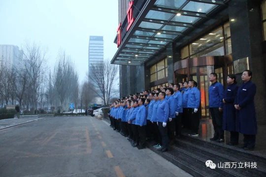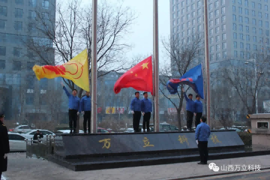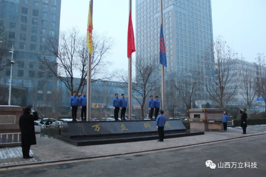 公司領(lǐng)導(dǎo)及全體員工精神抖擻,7時44分,升旗手和護旗方隊已整裝待發(fā),伴隨著旋律流暢、豪邁雄壯的《中國人民解放軍進行曲》,護旗方隊邁著節(jié)奏規(guī)整且堅實的步伐向升旗臺走來,展現(xiàn)出了萬立人團結(jié)協(xié)作的團隊精神。當(dāng)旗手將國旗、區(qū)旗、司旗移交升旗手,全體人員行注目禮時,明亮雄偉的《義勇軍進行曲》響起,旗幟緩緩升起,隨風(fēng)飄揚,像極了山西萬立科技有限公司30多年來的堅定不移、腳踏實地,也體現(xiàn)了萬立人的勇敢、堅強、團結(jié)一心。