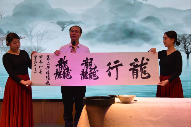 贠總在現場揮毫潑墨,寫下了“龍行龘龘”四個大字,寓意著萬立園區(qū)在新的一年里能夠聚力騰飛,取得更加輝煌的成就。藺總監(jiān)則為大家?guī)砹司殴?jié)鞭表演,他的技藝爐火純青,再一次點燃了現場的氣氛。